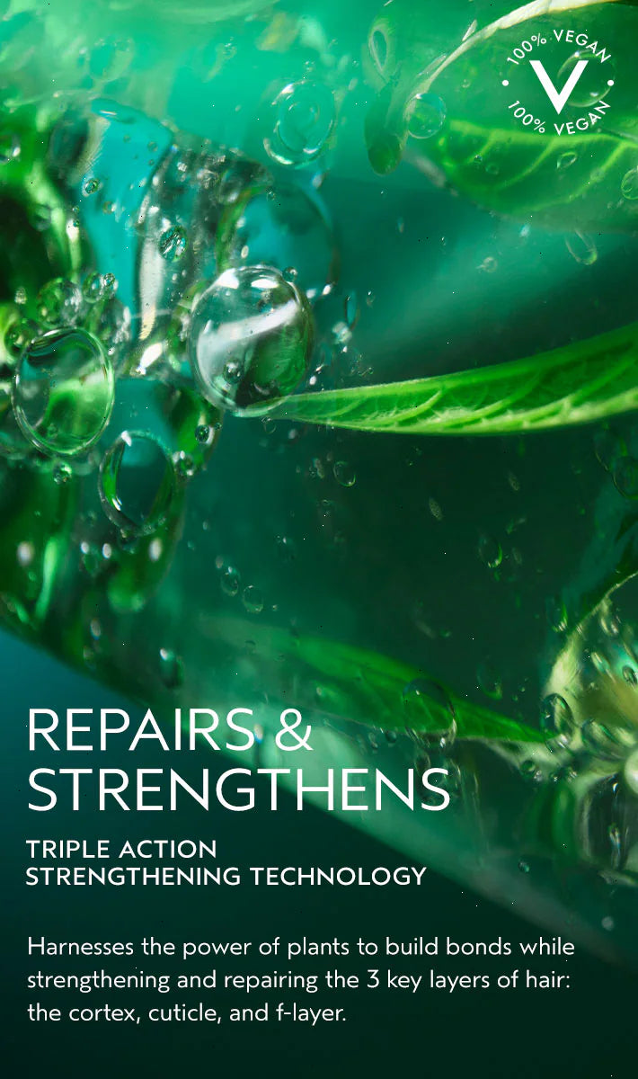 Triple Action Strengthening Technology • Plant-powered bond-building molecule strengthens and repairs from within • Nourishing macro green blend with avocado, green tea and sacha inchi oils helps to smooth, detangle and prevent breakage • Plant-derived complex protects and shields hair from future damage