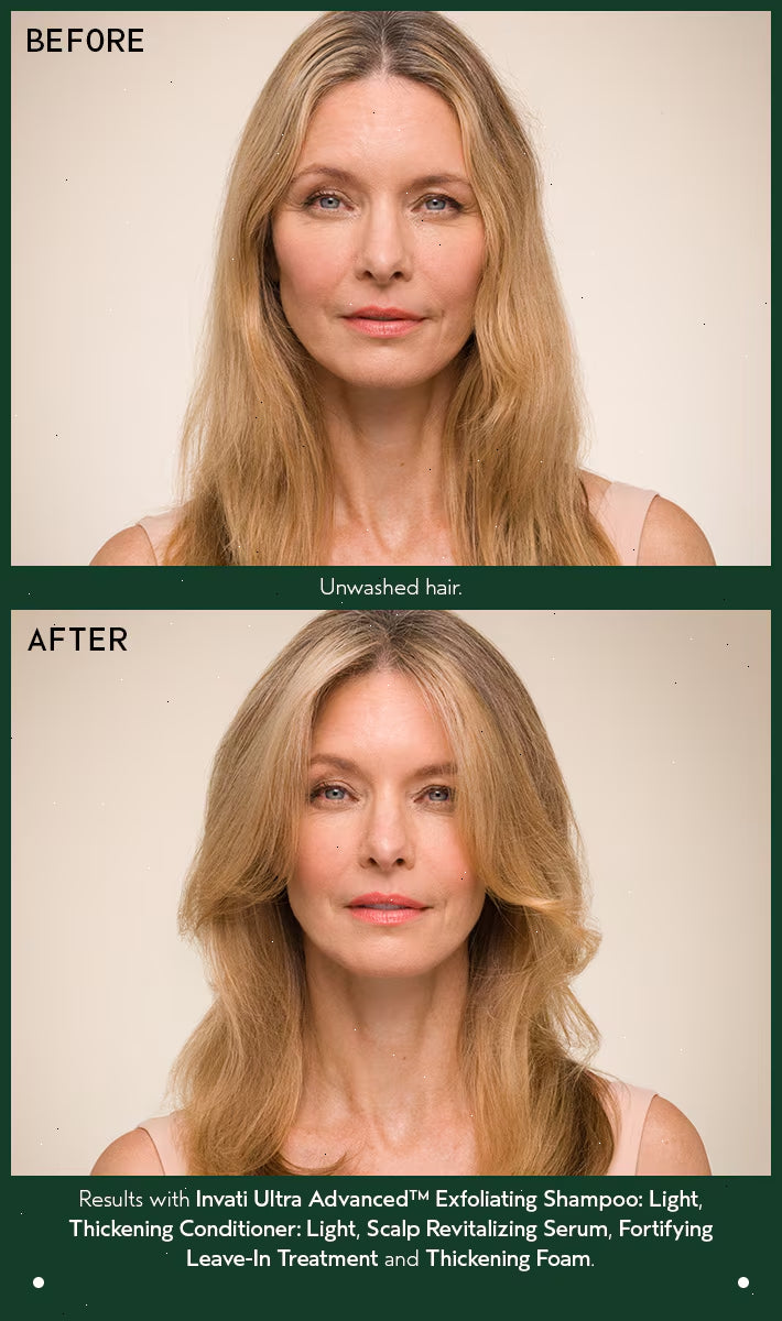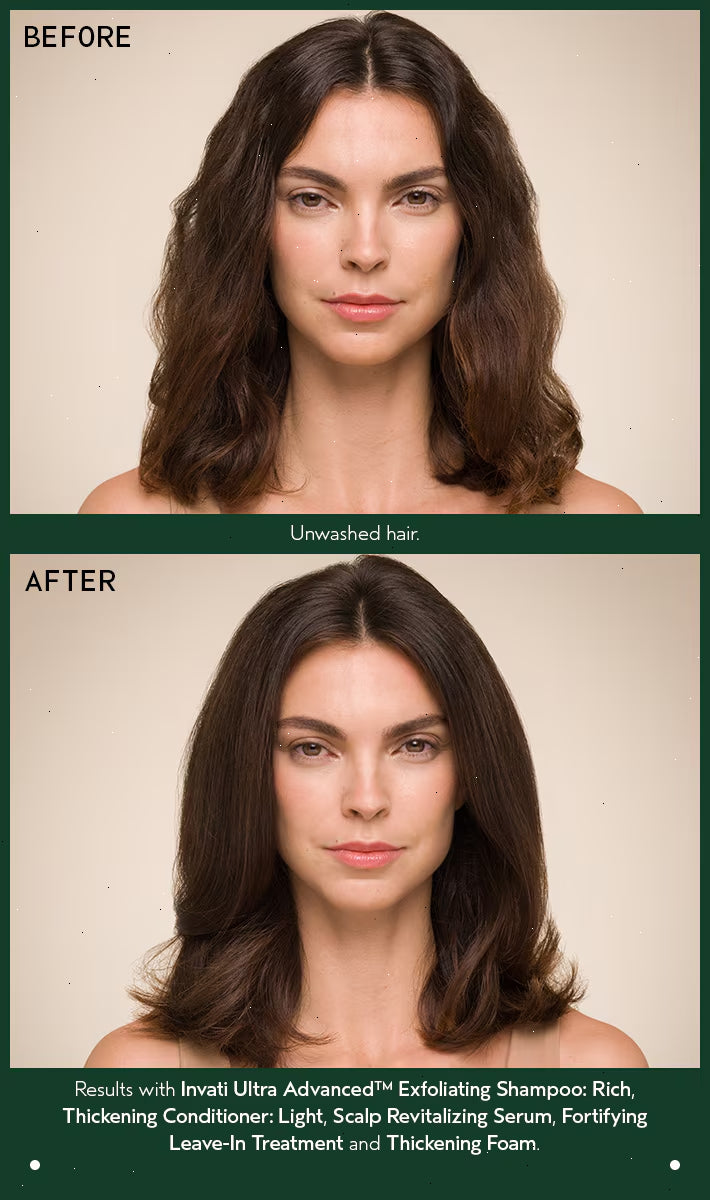 *Based on ex-vivo testing after using the Invati Ultra Advanced™ 5-step system of shampoo, conditioner, serum, leave-in and foam. On average, people have 100,000 strands of hair on the head. **Consumer testing on 105 women after using the product for 2 weeks. ***Naturally derived per the ISO 16128 Standard. From plant, non-petroleum mineral sources, and/or water.