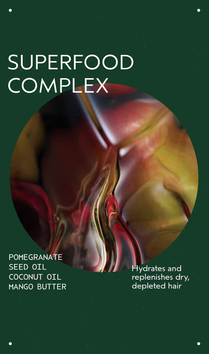 • luxurious omega-5-rich organic pomegranate oil nourishes dry, depleted hair
