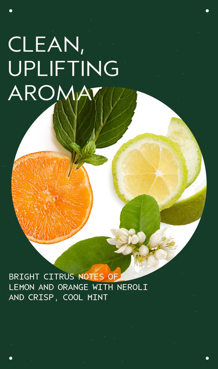 Aroma: A clean, uplifting aroma with bright citrus notes of lemon and orange on a light floral heart of neroli, balanced by delicate hints of crisp, cool mint.